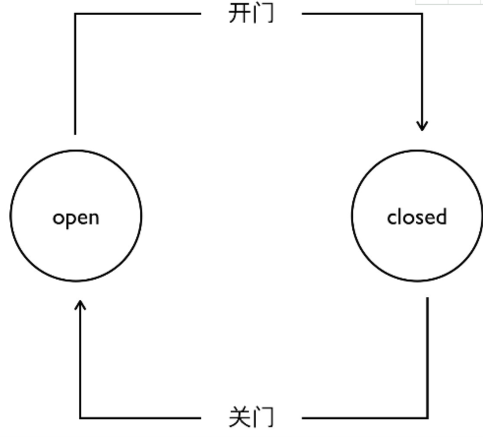 现实事物是有不同状态的,例如一个自动门,就有 open 和 closed 两种状态。我们通常所说的状态机是有限状态机,也就是被描述的事物的状态的数量是有限个,例如自动门的状态就是两个 open 和 closed ,如图: