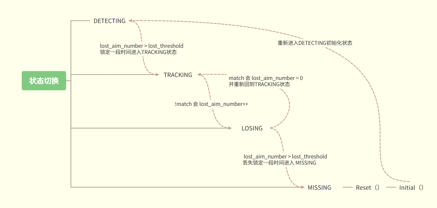 如果在此期间又出现锁定的装甲板ID,便会重新回到 TRACKING 状态,并将 lost_aim_number 清空