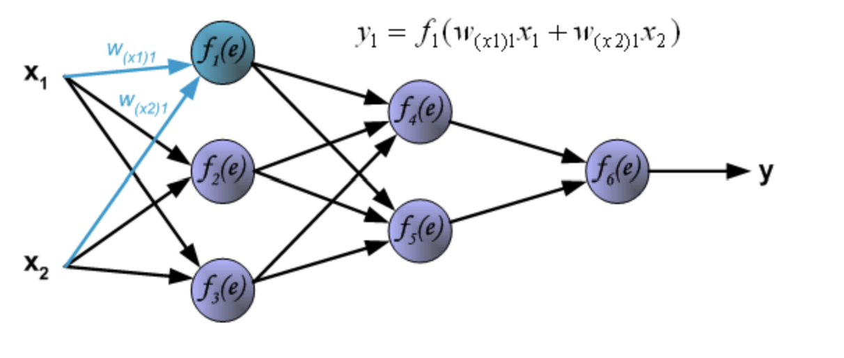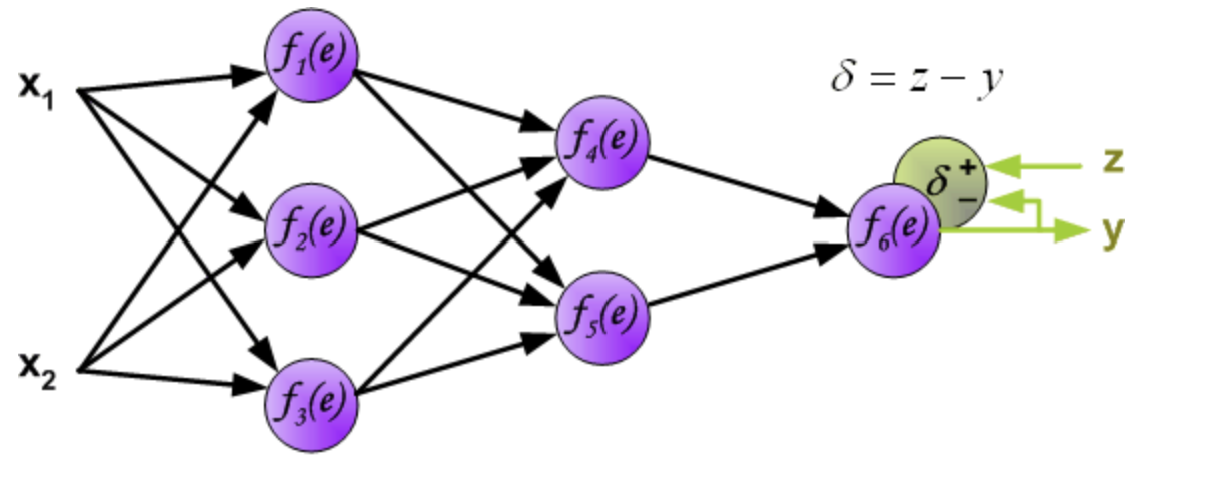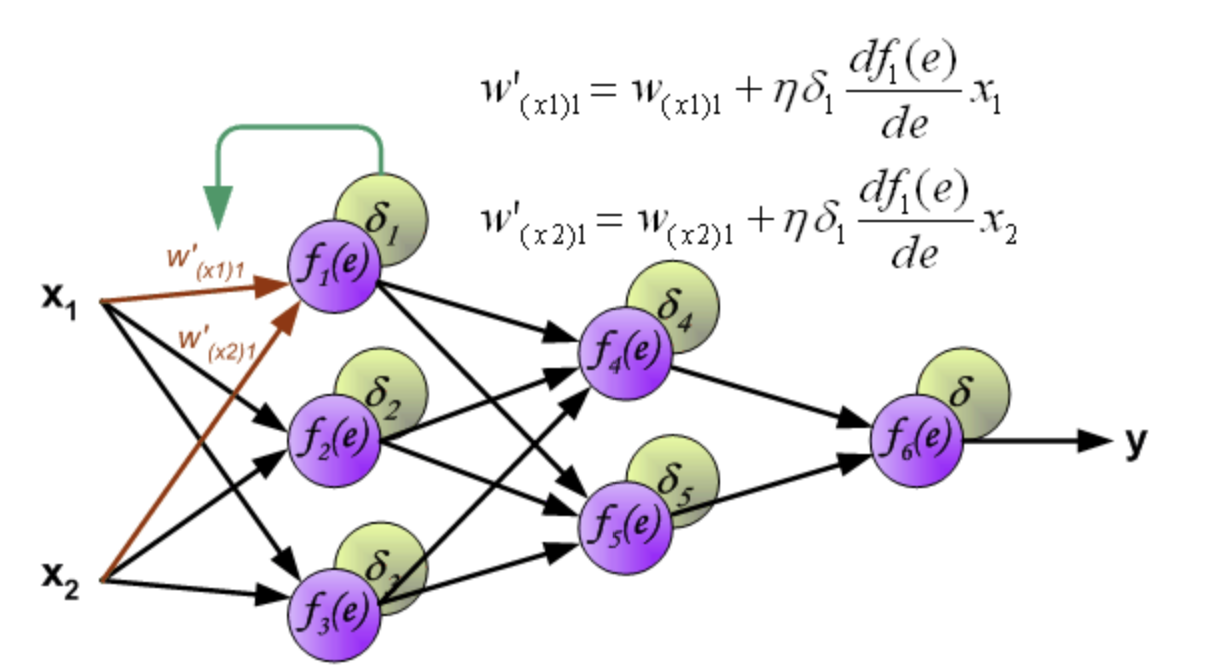 与前向传播时相同,反向传播时后一层的节点会与前一层的多个节点相连,因此需要对所有节点的误差求和。例如图中的神经元 f_1(e) 同时与 f_4(e) 和 f_5(e) 相连因此计算 f_1(e) 的误差时需要考虑后一层 f_4(e) 和 f_5(e) 的权重系数,因此δ1 = w_14 δ4 + w_15 δ5