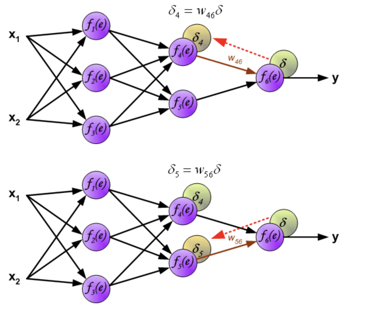 例:将误差 δ 向 f_4(e) 传播时,w_46 为 f_4(e) 的权重系数, f_4(e)的误差 δ4 = w_46 δ