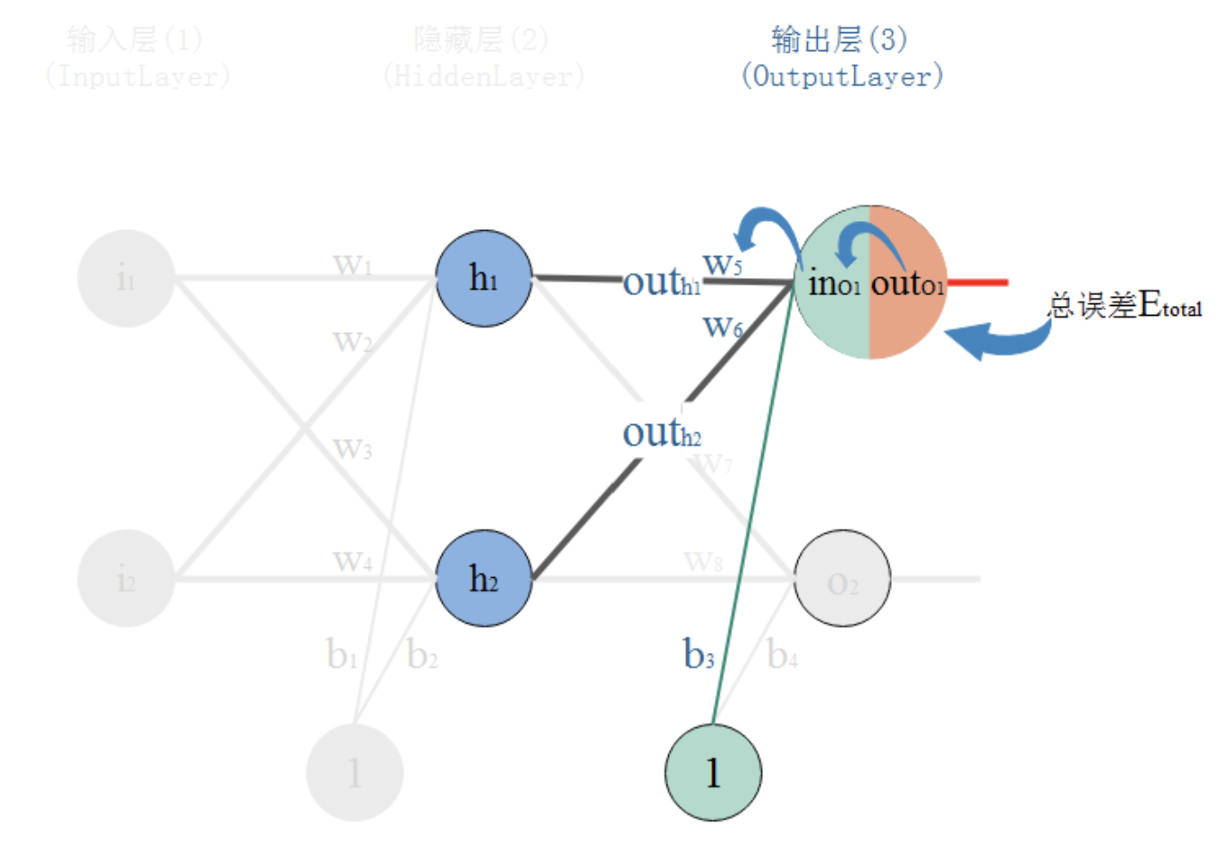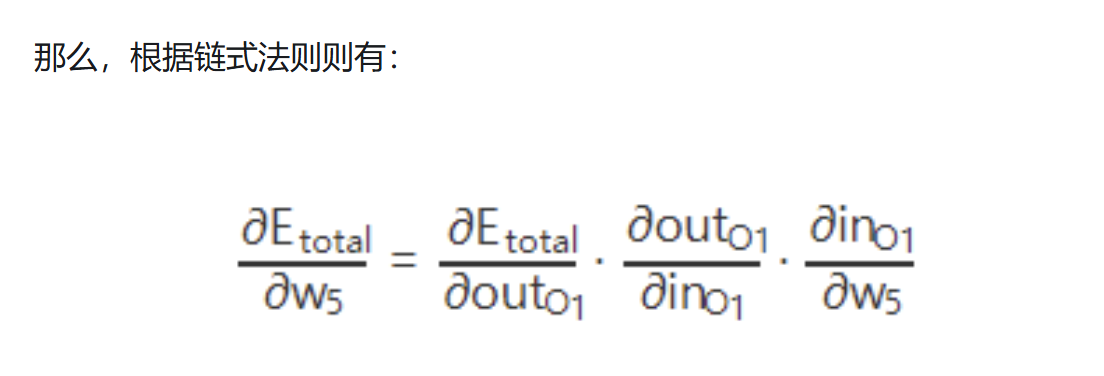 我们知道,权重w的大小能直接影响输出,w不合适那么会使得输出误差。要想直到某一个w值对误差影响的程度,可以用误差对该w的变化率来表达。如果w的一点点变动,就会导致误差增大很多,说明这个w对误差影响的程度就更大,也就是说,误差对该w的变化率越高。而误差对w的变化率就是误差对w的偏导。 所以,看下图,总误差的大小首先受输出层神经元O1的输出影响,继续反推,O1的输出受它自己的输入的影响,而它自己的输入会受到w5的影响。这就是连锁反应,从结果找根因。