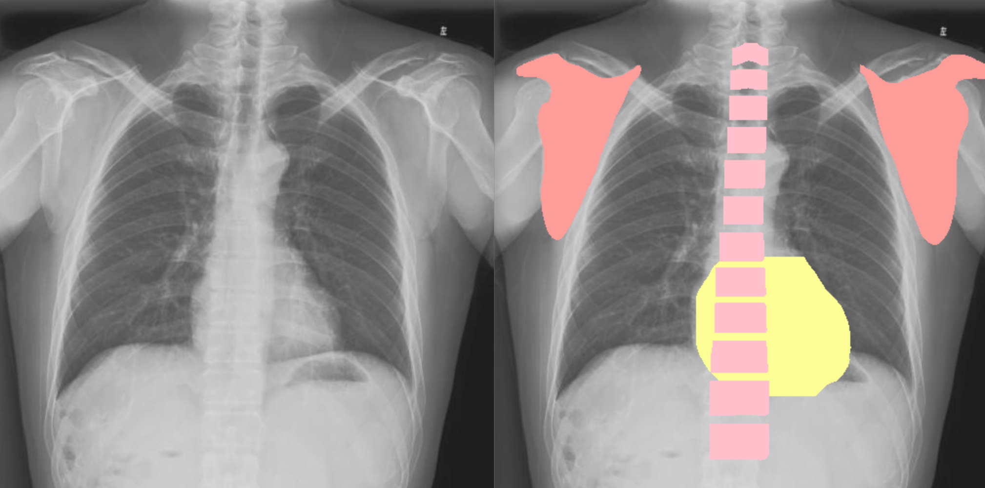 下面是一个正位胸片分割模型的展示,使用 yolov5-seg 进行模型训练,效果也是相当不错